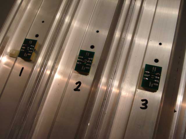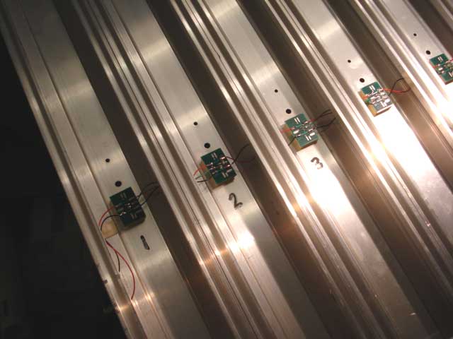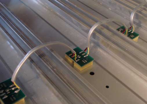 This is the standard illuminator supplied with the BestTrack Judge. Note that assembly consists of small circuit cards connected by cables that loop from lane to lane beneath the track. The assembly is subject to damage if the loops are accidently snagged during storage or transit. By burying the wiring within the track, the illuminators are protected from damage. |