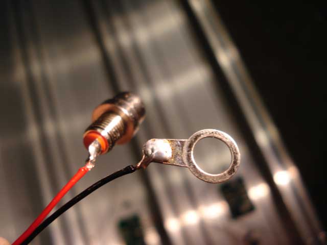 Finally, make a 1/4" hole on outside sidewall of Lane 1 to mount the connector shown here. Locate this hole three inches uphill or downhill from the finish line so that it does not interfere with the mounting blocks. Deburr all holes. The sharp edges can cut through the wiring insulation and cause a short circuit. Deburring can be done by carving off the burrs with a utility knife. It can also be done by hand-twisting a large diameter drill bit. It can also be done by a countersink drill bit. Mount the connector on Lane 1 using the supplied nut. |