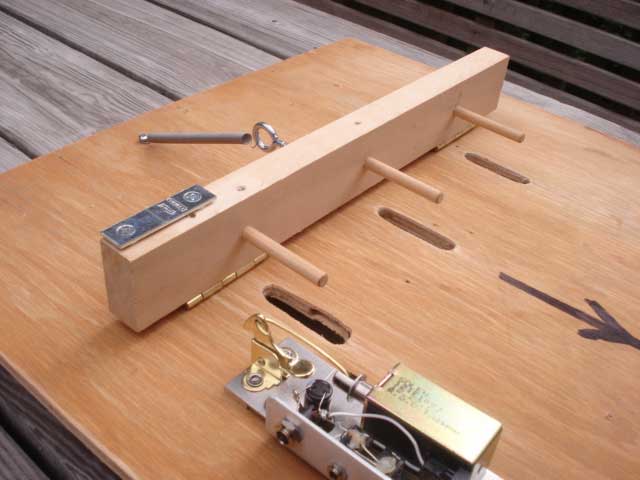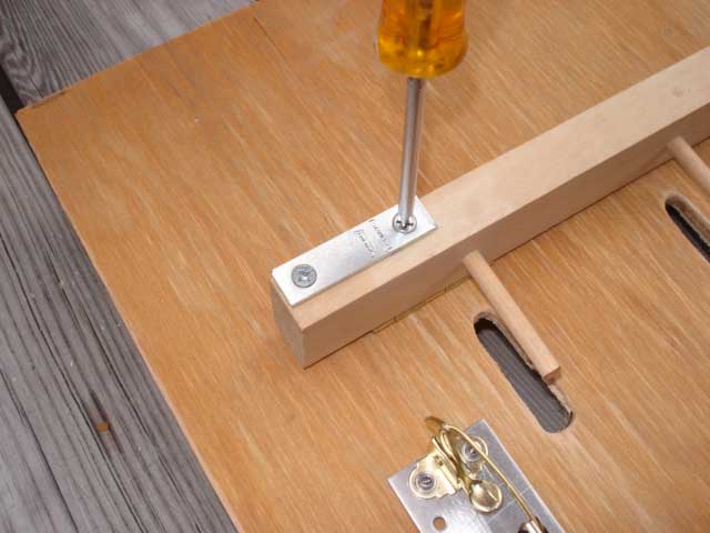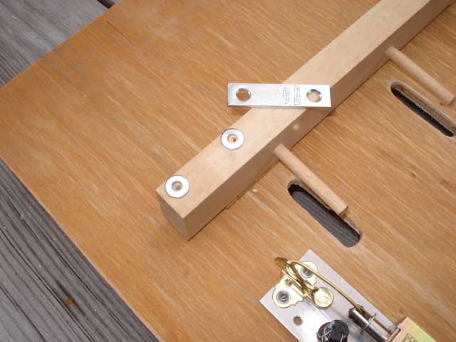 Step 2. The strike plate will be installed on the downhill surface of the peg bar. Use the two washers to hold the strike plate off from the peg bar surface. Carefully locate the strike plate vertically so that the latch tip will be just over the edge of the strike plate. Mark and drill pilot holes for the screws. |